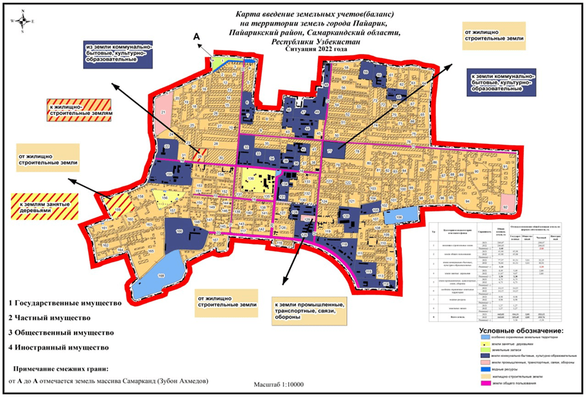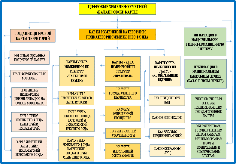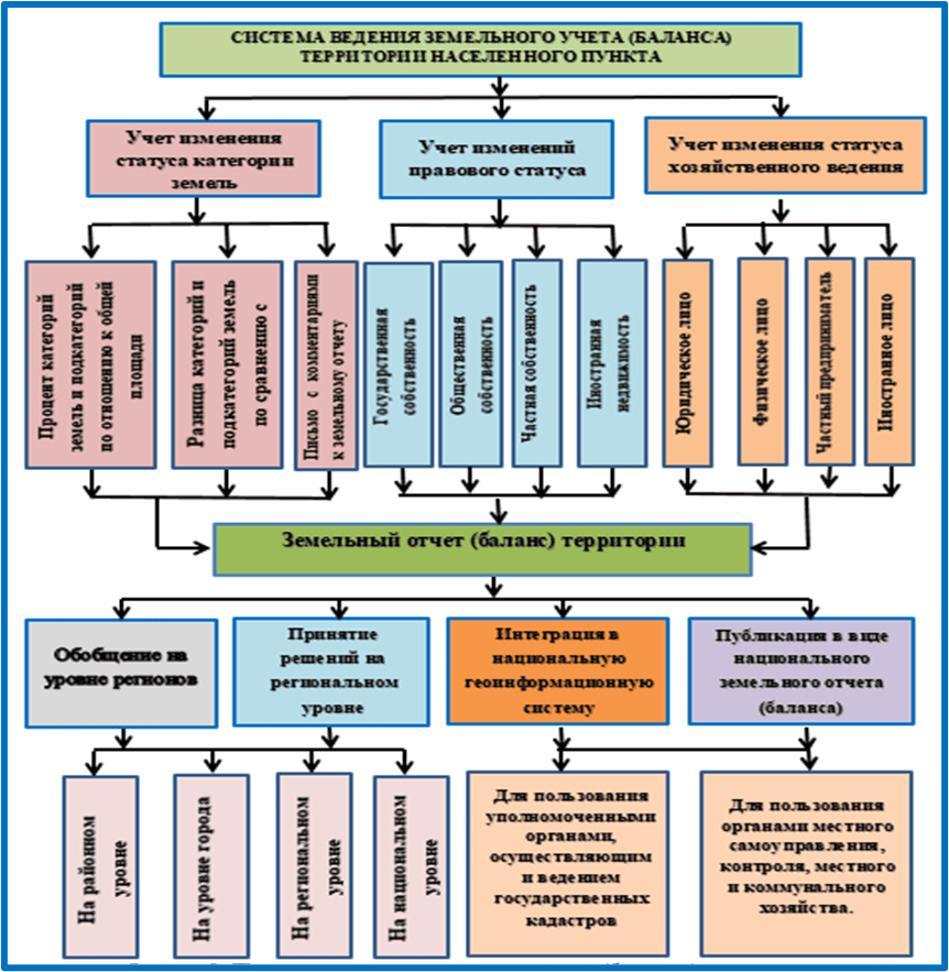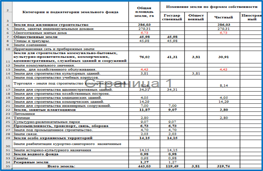 The report (balance) on the change in the area of land occupied by categories and subcategories of the land fund on the territory of a populated area, the forms of ownership of its users and the activities of economic management according to their "Land Categories". , "Legal" and "Economic Management" describes information on the digitization of status information and a map of the territory based on a geographic information system.