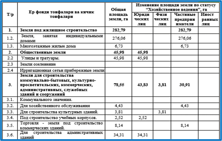 Báo cáo đất đai hiện tại được lập trên cơ sở các thông tin liên quan đến việc giao đất liên hộ, giao đất nội bộ của các hộ, các biện pháp kiểm soát khi tổng hợp thông tin địa chính và những thay đổi khác về quỹ đất và được tính đến trong báo cáo đất đai. Dựa trên cơ sở này, trong báo cáo đất đai của nước cộng hòa Uzbekistan (Bảng 1), đất của các khu dân cư (thành phố, thị trấn và nông thôn) được đưa ra dưới dạng thông tin [5;6].