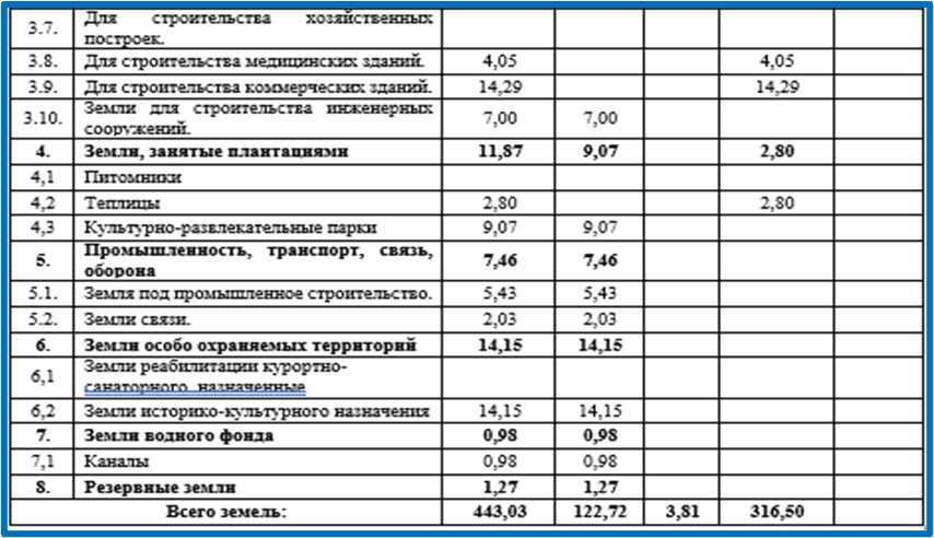 Chúng tôi thấy rằng các loại quỹ đất không bao gồm các quyền tài sản của tất cả người sử dụng đất và thông tin về sự biến động của thửa đất mà trái lại được tính là những thửa đất nằm ngoài ranh giới khu đất dân cư [5; 6], do đơn vị hành chính-lãnh thổ nằm trong lãnh thổ khu dân cư của các loại quỹ đất nằm trong đất của các thành phố (đô thị) [1; 2] tính toán phân bố theo tình hình đầu năm hiện tại và tùy theo hiện trạng thực tế của các loại quỹ đất và sử dụng diện tích các thửa đất bao gồm các khu dân sư cư, quận, vùng và toàn bộ lãnh thổ quốc gia nhằm đảm bảo cấu trúc, tính tổng quát và công bố báo cáo đất đai dựa trên thông tin về những thay đổi xảy ra vào cuối năm, cần lập báo cáo đất đai của khu vực vào đầu năm sau [3].