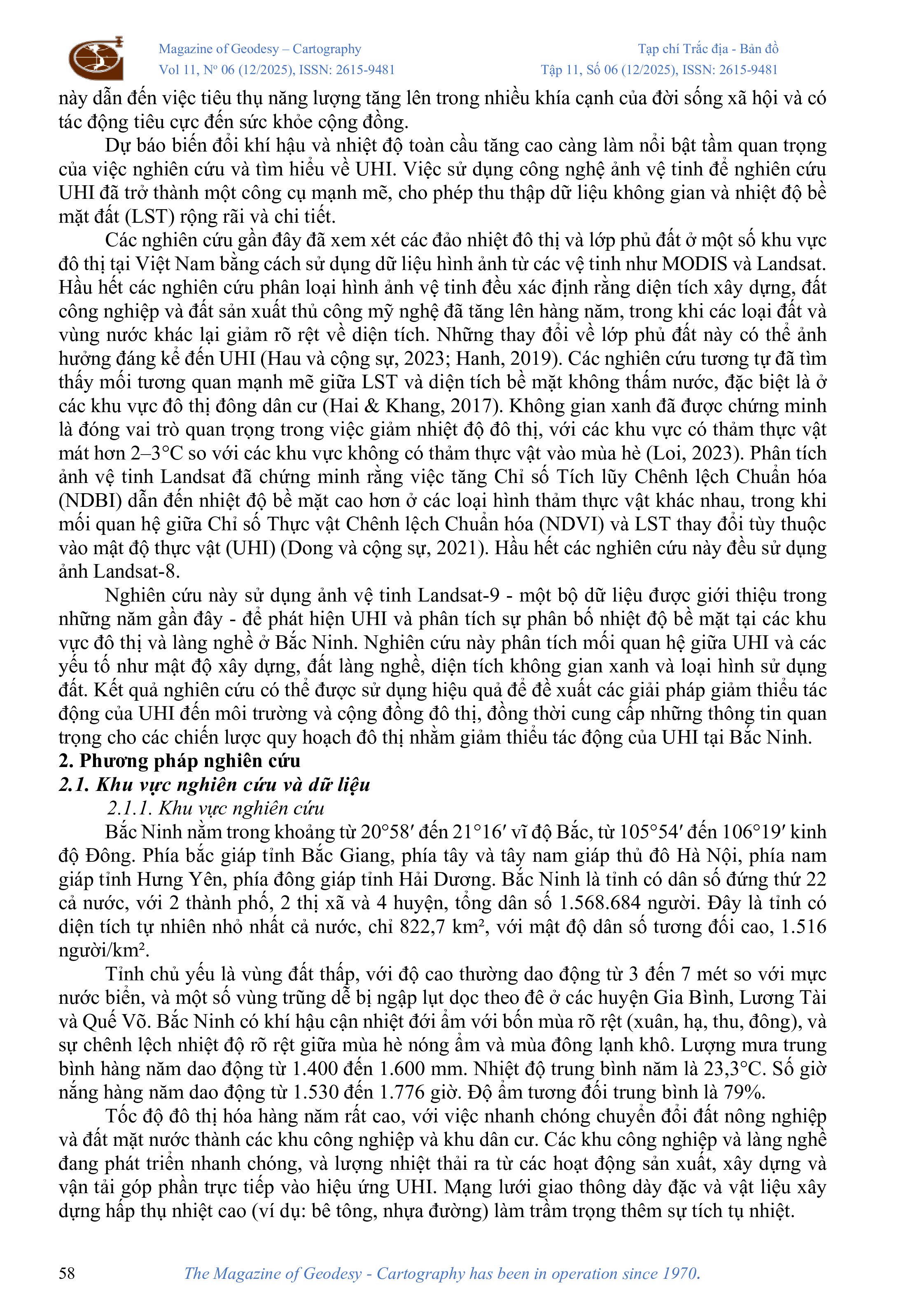 {"id":735645,"name":"Nghiên cứu hiện tượng đảo nhiệt đô thị tại khu vực làng nghề tại Bắc Ninh, Việt Nam","desc":"<p style=\"text-align:right;\"><span style=\"color:#4472C4;\">Tập 11, Số 06 (12\/2025), ISSN: 2615-9481 <\/span><\/p><p style=\"margin-left:0cm;text-align:right;\">Lê Minh Quân<\/p>","content":"<figure class=\"image\"><img src=\"\/datafiles\/46325\/upload\/images\/2026-02\/ceb7e2c4-0a98-4faf-9390-7173936cfbc0-56.jpg\"><\/figure><figure class=\"image\"><img src=\"\/datafiles\/46325\/upload\/images\/2026-02\/ceb7e2c4-0a98-4faf-9390-7173936cfbc0-57.jpg\"><\/figure><figure class=\"image\"><img src=\"\/datafiles\/46325\/upload\/images\/2026-02\/ceb7e2c4-0a98-4faf-9390-7173936cfbc0-58.jpg\"><\/figure><figure class=\"image\"><img src=\"\/datafiles\/46325\/upload\/images\/2026-02\/ceb7e2c4-0a98-4faf-9390-7173936cfbc0-59.jpg\"><\/figure><figure class=\"image\"><img src=\"\/datafiles\/46325\/upload\/images\/2026-02\/ceb7e2c4-0a98-4faf-9390-7173936cfbc0-60.jpg\"><\/figure><figure class=\"image\"><img src=\"\/datafiles\/46325\/upload\/images\/2026-02\/ceb7e2c4-0a98-4faf-9390-7173936cfbc0-61.jpg\"><\/figure><figure class=\"image\"><img src=\"\/datafiles\/46325\/upload\/images\/2026-02\/ceb7e2c4-0a98-4faf-9390-7173936cfbc0-62.jpg\"><\/figure><figure class=\"image\"><img src=\"\/datafiles\/46325\/upload\/images\/2026-02\/ceb7e2c4-0a98-4faf-9390-7173936cfbc0-63.jpg\"><\/figure><figure class=\"image\"><img src=\"\/datafiles\/46325\/upload\/images\/2026-02\/ceb7e2c4-0a98-4faf-9390-7173936cfbc0-64.jpg\"><\/figure><figure class=\"image\"><img src=\"\/datafiles\/46325\/upload\/images\/2026-02\/ceb7e2c4-0a98-4faf-9390-7173936cfbc0-65.jpg\"><\/figure>","image_url":"https:\/\/www.geocartagis.org\/datafiles\/46325\/upload\/images\/06_25\/Picture5.jpg?t=1771951291","image_thumb_url":"https:\/\/www.geocartagis.org\/datafiles\/46325\/upload\/thumb_images\/06_25\/Picture5.jpg?t=1771952353","tags":["Nghiên cứu hiện tượng đảo nhiệt đô thị tại khu vực làng nghề tại Bắc Ninh","Việt Nam"],"count_view":416,"seo_name":"nghien-cuu-hien-tuong-dao-nhiet-do-thi-tai-khu-vuc-lang-nghe-tai-bac-ninh-viet-nam","date_update":1771951200,"date_created_format":1771951484,"meta_title":"Nghiên cứu hiện tượng đảo nhiệt đô thị tại khu vực làng nghề","meta_desc":"Nghiên cứu này sử dụng dữ liệu ảnh vệ tinh Landsat-9 để phân tích hiện tượng Đảo nhiệt đô thị (UHI) tại khu vực làng nghề Bắc Ninh, Việt Nam. Đây là khu vực có khả năng đang bị ô nhiễm môi trường, nhiệt độ...","meta_keyword":"Nghiên cứu hiện tượng đảo nhiệt đô thị tại khu vực làng nghề tại Bắc Ninh,Việt Nam","qr_code":"https:\/\/www.geocartagis.org\/nghien-cuu-hien-tuong-dao-nhiet-do-thi-tai-khu-vuc-lang-nghe-tai-bac-ninh-viet-nam","title_page":"Số báo hiện thời","relate_object_id":735645,"company_logo":"https:\/\/www.geocartagis.org\/datafiles\/46325\/upload\/images\/B%C3%ACa%20TC\/logo_Header.PNG","company_name":"Tạp chí Trắc địa - Bản đồ","company_email":"geocartagis@gmail.com","company_phone":"0913345919","company_address":"Số 2 Đặng Thùy Trâm, phường Nghĩa Đô, thành phố Hà Nội","company_fax":"","date_now":1776520590,"company_tags":["Trắc địa - Bản đồ","Thông tin Địa lý","Quản lý đất đai","Bất động sản\nKhoa học trái đất","Môi trường","Địa chất","Biến đổi khí hậu"],"search_keyword":null,"facebook_comment":"https:\/\/www.geocartagis.org\/nghien-cuu-hien-tuong-dao-nhiet-do-thi-tai-khu-vuc-lang-nghe-tai-bac-ninh-viet-nam","breadscrumb":[{"url":"https:\/\/www.geocartagis.org","name":"Trang chủ","icon":"","active":false},{"url":"https:\/\/www.geocartagis.org\/so-bao-hien-thoi-1709396679","name":"Số báo hiện thời","icon":"","active":false},{"url":"https:\/\/www.geocartagis.org\/nghien-cuu-ung-dung","name":"Nghiên cứu, ứng dụng","icon":"","active":true}],"list_products_tmp":[],"list_section":[{"id":436746,"name":"SECTION-99232","seo_name":"#w30s-section-436746","url":"#w30s-section-436746"},{"id":436749,"name":"SECTION-99240","seo_name":"#w30s-section-436749","url":"#w30s-section-436749"},{"id":436750,"name":"SECTION-99475","seo_name":"#w30s-section-436750","url":"#w30s-section-436750"},{"id":436768,"name":"SECTION-99485","seo_name":"#w30s-section-436768","url":"#w30s-section-436768"},{"id":436769,"name":"SECTION-99486","seo_name":"#w30s-section-436769","url":"#w30s-section-436769"},{"id":436747,"name":"SECTION-99234","seo_name":"#w30s-section-436747","url":"#w30s-section-436747"}],"type_page":7,"id_page":293667,"widget_11234455":{"content_data":{"content":" Thứ 2 - thứ 7"}},"widget_11234453":{"content_data":[{"id":48682,"title":"Viet Nam","code":"vn","is_expires":false,"is_active":1},{"id":48683,"title":"American","code":"us","is_expires":false,"is_active":0}]},"widget_10923495":{"content_data":{"content":"Lượt xem"}},"widget_10923499":{"content_data":{"content":"Tags: "}},"widget_10923503":{"content_data":{"content":"DANH MỤC TIN TỨC\n"}},"widget_10923506":{"content_data":{"content":"tin tức cập nhật"}},"widget_10923512":{"content_data":{"content":"tin tức liên quan"}},"widget_10923523":{"content_data":{"content":"Lượt xem"}},"widget_10923519":{"content_data":{"content":"Xem thêm"}},"widget_10923269":{"content_data":{"content":"Trụ sở: Số 2 Đặng Thùy Trâm, phường Nghĩa Đô, thành phố Hà Nội"}},"widget_11124121":{"content_data":{"content":"Văn phòng: Số 45 Nguyễn Trãi, phường Khương Đình, thành phố Hà Nội"}},"widget_10923668":{"content_data":{"content":"Số điện thoại: 0913345919"}},"widget_10938675":{"content_data":{"content":"ISSN: 2615-9481"}},"widget_10923275":{"content_data":{"content":"Email: geocartagis@gmail.com "}},"widget_10923278":{"content_data":{"content":"Thông tin thêm\n"}},"widget_10923279":{