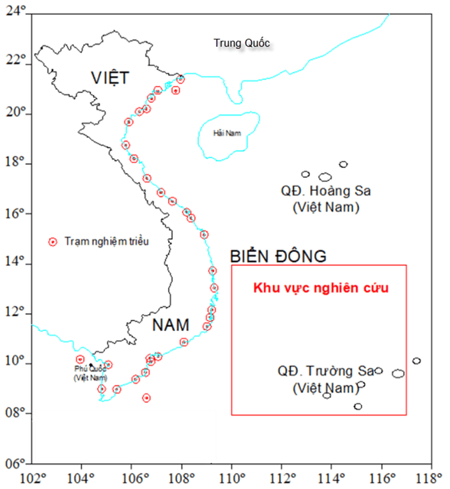 Để xác định chênh lệch giữa mặt biển trung bình quốc gia và quốc tế, số liệu 31 trạm nghiệm triều đã được sử dụng. Số liệu các trạm nghiệm triều được tham khảo trong tài liệu [7]. Vị trí các trạm nghiệm triều được thể hiện trên Hình 1.