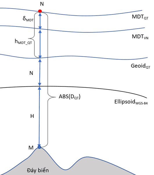 Trong đó: DQT là độ sâu (có giá trị âm), tính từ mặt biển trung bình quốc tế xuống đáy biển; ABS(DQT) là giá trị tuyệt đối của độ sâu; δMDT là chênh lệch giữa mặt biển trung bình Việt Nam và mặt biển trung bình quốc tế, trong nghiên cứu này, là mặt DTU15MDT; hMDT là độ cao mặt biển trung bình quốc tế (tính từ geoid quốc tế, tương ứng với DTU15MDT là geoid EIGEN6C4); N là độ cao geoid so với WGS-84; H là độ cao trắc địa trong hệ WGS-84 của điểm ở đáy biển.