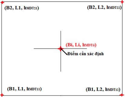 Để nội suy được các giá trịhMDTtừ mô hình DTU15MDT quốc tế, chúng ta có thể sử dụngcác phương pháp nội suy như: Kriging, Collocation, trọng số nghịch đảo khoảng cách, Spline, bi-linear v.v…Khi mô hình MDT được xây dựng ở dạng mắt lưới thì sử dụng phương pháp nội suy song tuyến (bi-linear) dựa vào bốn điểm mắt lưới để nội suyđộ cao địa hình mặt biển trung bình sẽ là phương án tối ưu nhất (xem Hình 4).