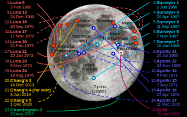 Kể từ khi Liên Xô phóng vệ tinh đầu tiên của Trái đất, Mặt đã được con người thám hiểm đầu tiên ngày 13/9/1959. Sau đó cả Liên Xô, Mỹ, và sau này Trung Quốc đã liên tục phóng các con tầu vũ trụ có người lái và không có người lái đổ bộ xuống mặt trăng. Tuy nhiên hạ cánh xuống cực nam của mặt trăng vẫn còn chưa có quốc gia nào làm được. Cuối năm 2023 và đầu năm 2024 cả Ấn Độ, Nga, Mỹ, Nhật Bản đều đã phóng tầu vũ trụ lên mặt trăng, tuy nhiên tàu vũ trụ Chandrayaan-3 của Ấn Độ đã đổ bộ thành công xuống gần cực nam của Mặt Trăng - một khu vực chưa được khám phá, được mệnh danh là “vùng tối của Mặt Trăng.” Thành tích này đưa Ấn Độ trở thành quốc gia thứ tư thành công trong việc đưa tàu vũ trụ lên vệ tinh của Trái đất, sau Mỹ, Liên Xô, và Trung Quốc.