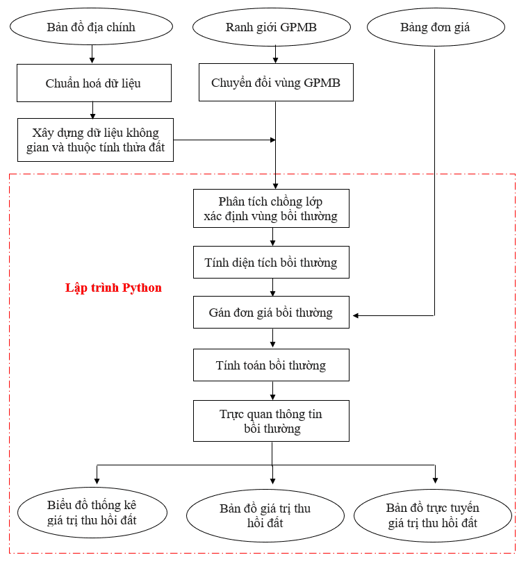 Công tác bồi thường giải phóng mặt bằng phục vụ dự án mở rộng tuyến đường được triển khai thông qua nhiều công đoạn bao gồm: thu thập và chuẩn hóa dữ liệu, xây dựng cơ sở dữ liệu không gian – thuộc tính thửa đất, xác định khu vực bồi thường, tính toán giá trị đất bị thu hồi và trực quan hóa thông tin phục vụ công tác quản lý, giám sát và ra quyết định được thể hiện qua sơ đồ hình 1.