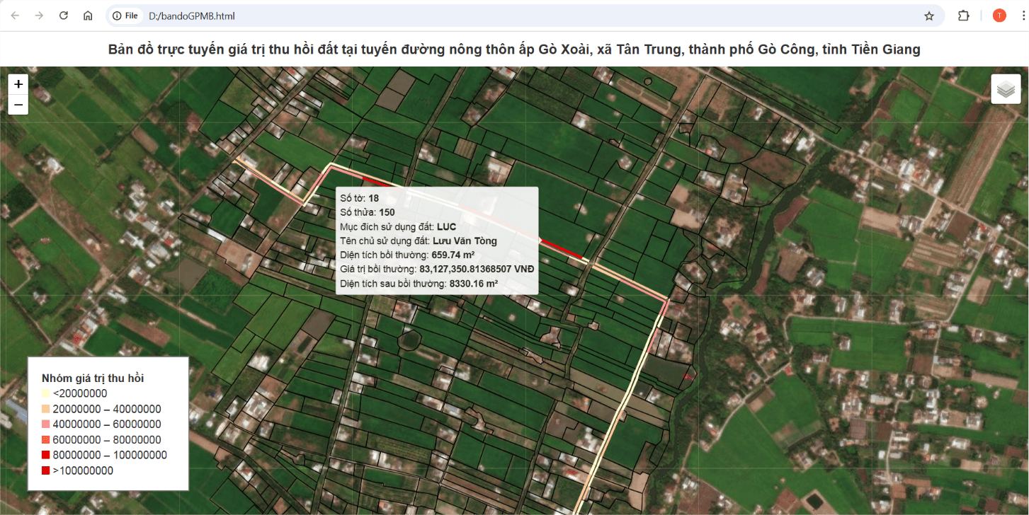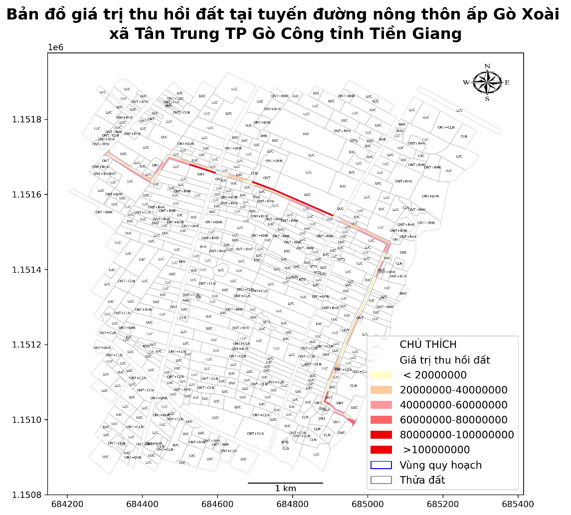 Với sự tích hợp của hệ thống thông tin địa lý (GIS) và các thư viện Python mã nguồn mở hỗ trợ phân tích không gian xác định vùng bồi thường và tính toán giá trị thu hồi đất đã được thực hiện một cách hệ thống và chính xác. Cụ thể, tại khu vực tuyến đường nông thôn ấp Gò Xoài, xã Tân Trung, thành phố Gò Công, tỉnh Tiền Giang, dữ liệu không gian về thửa đất, ranh giới quy hoạch tuyến đường đã được xử lý để xác định ranh giới các khu vực bồi thường, phân loại đất theo mục đích sử dụng và áp dụng đơn giá tương ứng để tính toán giá trị bồi thường cho từng thửa đất.