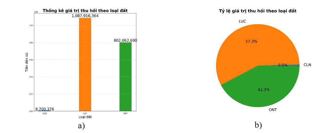 Bên cạnh việc tính toán chi tiết giá trị bồi thường theo từng thửa đất, bài báo còn tiến hành lập trình và xây dựng các biểu đồ thống kê nhằm trực quan hóa sự phân bố giá trị bồi thường theo loại đất, giúp người đọc dễ dàng nhận diện và so sánh giữa các nhóm đất khác nhau. Cụ thể, Hình 3a thể hiện biểu đồ cột, trong khi Hình 3b sử dụng biểu đồ tròn, cả hai cùng phân tích dữ liệu dựa trên ba loại đất chính tại khu vực nghiên cứu, bao gồm: đất trồng lúa (LUC), đất trồng cây lâu năm (CLN), và đất ở nông thôn (ONT). Kết quả cho thấy, đất trồng lúa LUC chiếm tỷ trọng lớn nhất, với tổng giá trị bồi thường đạt 1.087.916.364 VNĐ, tương ứng với 57,3% tổng giá trị bồi thường toàn khu vực. Giá trị này vượt trội so với hai loại đất còn lại là CLN và ONT. Nguyên nhân chủ yếu xuất phát từ đặc điểm kinh tế - xã hội của địa phương: ấp Gò Xoài có nền kinh tế chủ lực dựa vào sản xuất nông nghiệp, đặc biệt là trồng lúa nước. Do đó, diện tích đất LUC chiếm ưu thế rõ rệt, kéo theo tổng giá trị thu hồi ở nhóm đất này cũng cao hơn. Mặt khác, dự án mở rộng tuyến đường triển khai tại khu vực nông thôn, có giá đất thấp và mật độ dân cư không cao, nên chi phí bồi thường đối với đất ở (ONT) không quá lớn. Điều này góp phần làm cho tổng giá trị bồi thường nghiêng mạnh về nhóm đất nông nghiệp, cụ thể là đất trồng lúa. Việc trực quan hóa dữ liệu bằng biểu đồ không chỉ hỗ trợ so sánh nhanh chóng giữa các loại đất, mà còn giúp làm rõ mối liên hệ giữa đặc điểm sử dụng đất, điều kiện kinh tế địa phương và chính sách bồi thường, từ đó phục vụ hiệu quả cho quá trình lập kế hoạch và ra quyết định trong công tác thu hồi đất và phát triển hạ tầng giao thông tại khu vực.