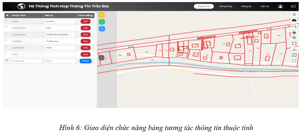 Sau khi chọn đối tượng được hiển thị trên bản đồ nền các thông tin thuộc tính của đối tượng đó được cập nhật vào bộ nhớ tạm của hệ thống và hiển thị chúng trong bảng này. Tại đây người dùng có thể thêm thuộc tính và giá trị mới bằng cách nhập tên thuộc tính và giá trị của thuộc tính đó sau đó nhấn nút thêm. Chức năng sửa đổi giá trị thuộc tính và xóa cũng tương tự, người dùng chỉ cần nhập giá trị mới sau đó nhấn enter hoặc nhấn vào nút xóa ở dòng tương ứng, các giá trị này lập tức được lưu vào trong CSDL. Hệ thống hỗ trợ hiển thị bảng thuộc tính đi kèm với lớp dữ liệu không gian. Người dùng có thể nhấp vào từng đối tượng để xem chi tiết thông tin như tên, loại, mã ID, tọa độ,... đồng thời cho phép lọc, tìm kiếm hoặc trích xuất dữ liệu sang định dạng bảng CSV để sử dụng ngoài hệ thống. Bảng thuộc tính là công cụ hỗ trợ thiết thực cho quá trình kiểm tra, xác minh và xử lý thông tin đo đạc tại hiện trường. Khả năng tương tác hai chiều giữa bản đồ và bảng giúp nâng cao hiệu quả xử lý và kiểm tra dữ liệu trực tiếp tại thực địa (Hình 6).