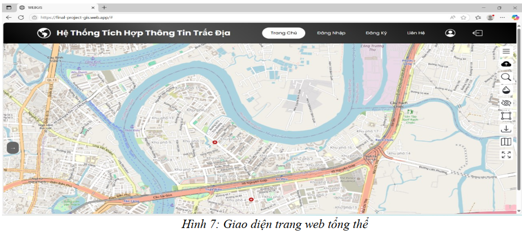 Trang web của hệ thống được thiết kế với bố cục rõ ràng, chia thành các khu vực chức năng như thanh công cụ điều hướng, cửa sổ bản đồ trung tâm và khu vực bảng thuộc tính. Giao diện trực quan, dễ sử dụng, phù hợp với người dùng có trình độ tin học cơ bản. Ngoài ra, trang web còn tích hợp khả năng phản hồi nhanh với thao tác người dùng và tương thích trên nhiều thiết bị khác nhau. Thiết kế giao diện tổng thể đơn giản nhưng hiệu quả, đảm bảo tính thân thiện và khả năng truy cập cao. Việc sử dụng mã nguồn mở giúp linh hoạt trong nâng cấp và mở rộng tính năng theo nhu cầu sử dụng thực tế.